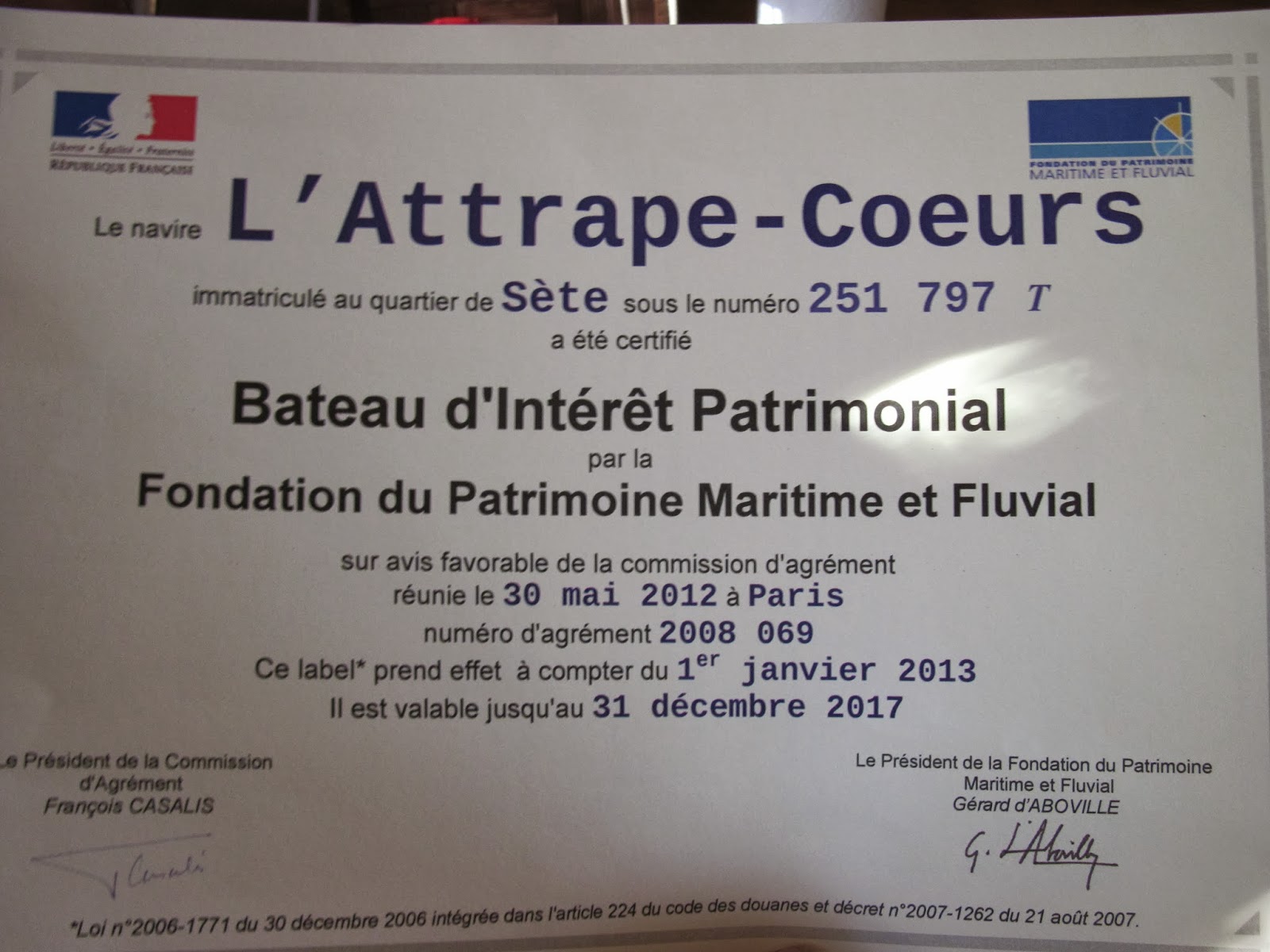 This yacht has been certified boat Patrimonial Interest by the Heritage Foundation Maritime and river. The label took effect from 1 January 2013.
